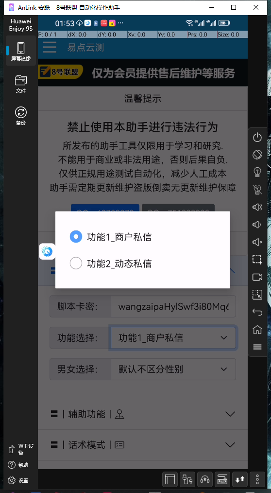 本站助手是为减少繁琐的手工操作开发的自动化测试工具,纯粹的代替人工完成繁杂的鼠标和键盘点击操作流程测试,严格遵守计算机相关法律法规,一切由用户使用产生的后果及责任由使用者自行承担,我站及助手开发人员不承担任何相关及其连带责任,特此申明!如果我们无意中侵犯了您的知识产权,敬请告之,我们核实后,将在第一时间删除,谢谢! 请勿使用软件发送违规内容!禁止使用助手发送非法内容和引流后变相欺骗等黑操作 !
