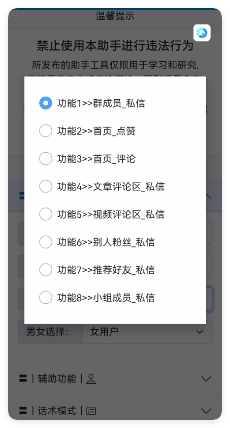 软件请勿用于非法用途,请勿用于诈骗、博彩、色情等黑、灰产产业,一经发现取消使用助手资格,不会进行任何的售后指导,如产生任何法律纠纷与本站无关。